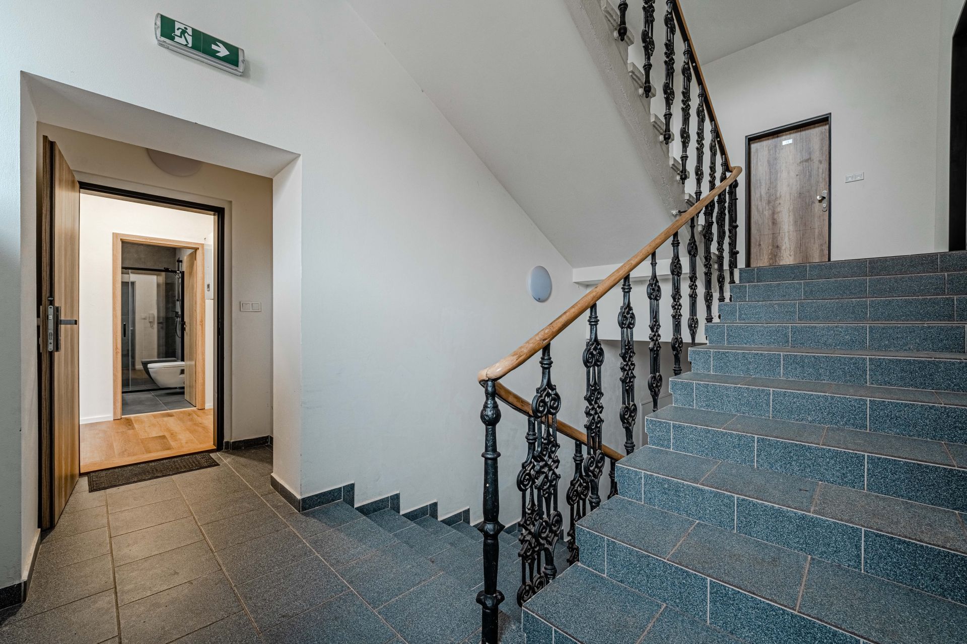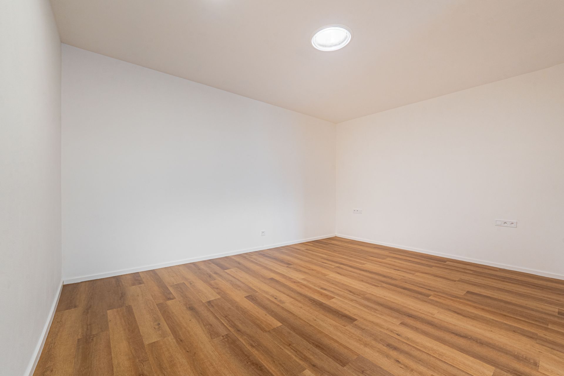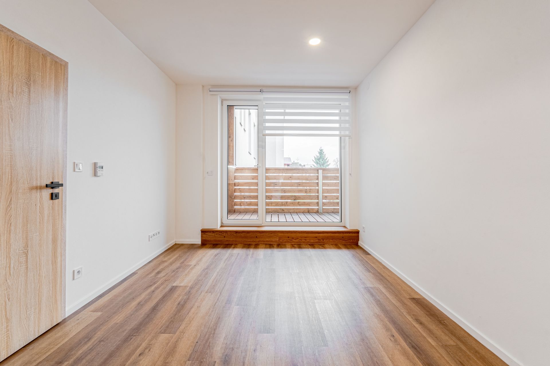 Dispozice: vstupní chodba, koupelna s WC, prostorný pokoj s kuchyňským koutem a vstupem na balkon. Příslušenství bytu tvoří sklep 3,4 m².