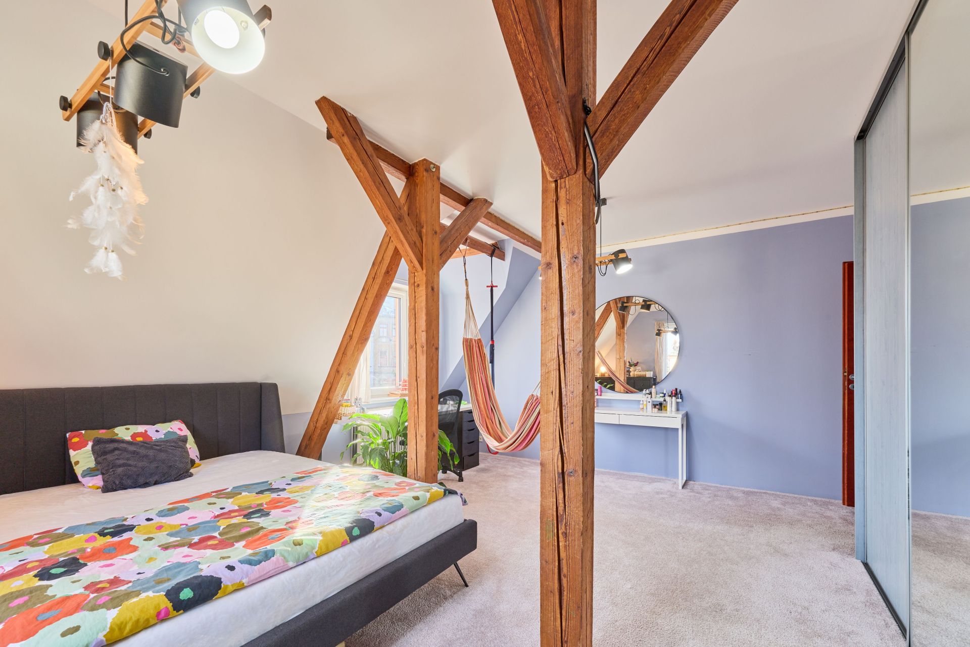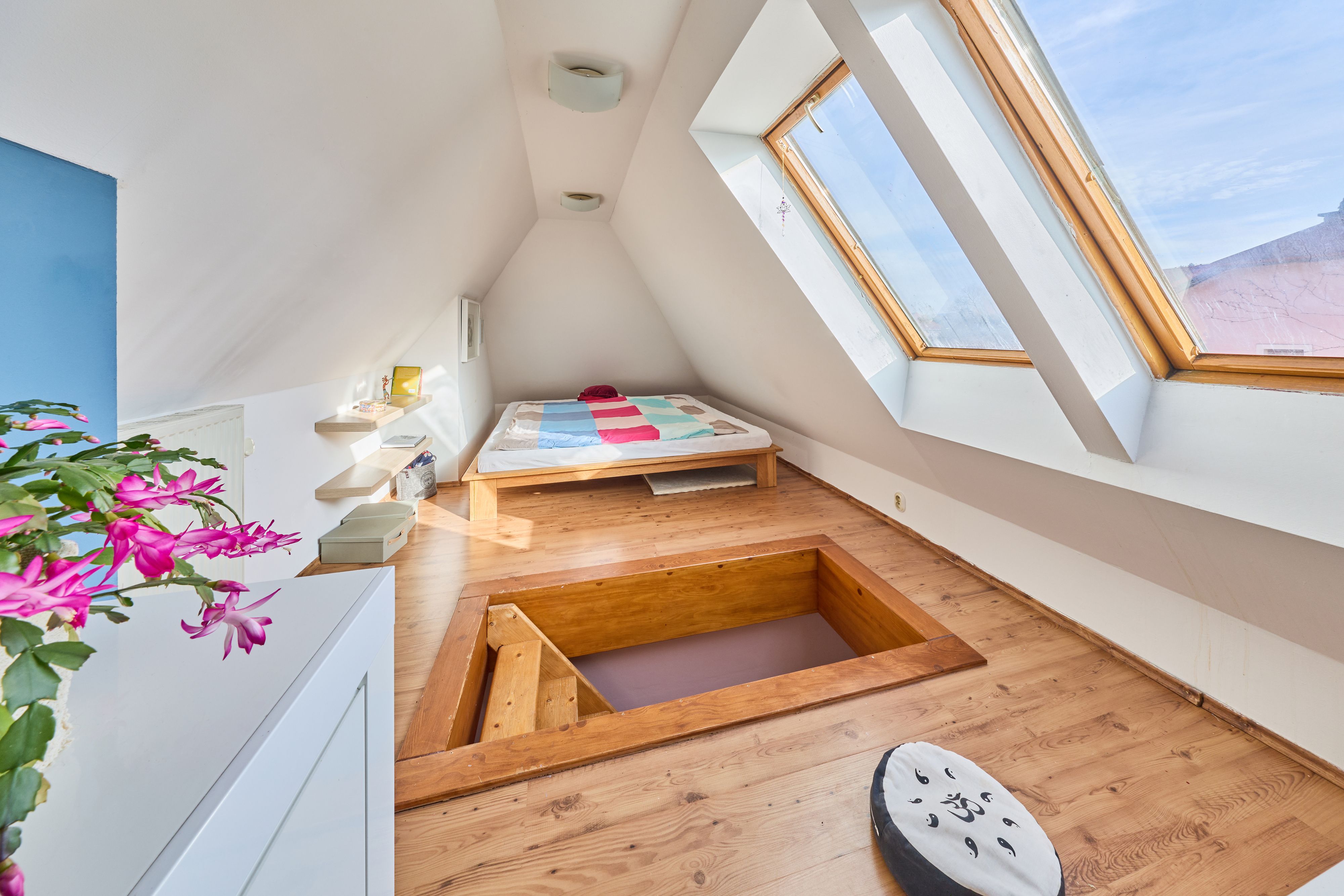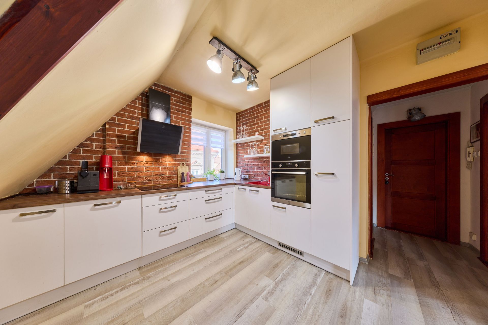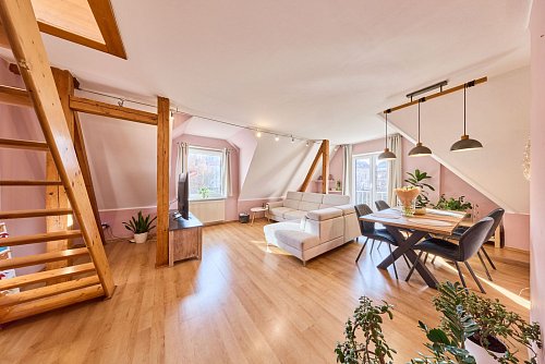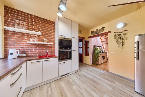 Dispozice: vstupní chodba, kuchyně s novou kuchyňskou linkou, technická místnost, koupelna s vanou a WC, prostorná ložnice a obývací pokoj. Z obývacího pokoje vede schodiště do mezonetového patra, kde se nachází další samostatný pokoj. K bytu náleží také sklep.