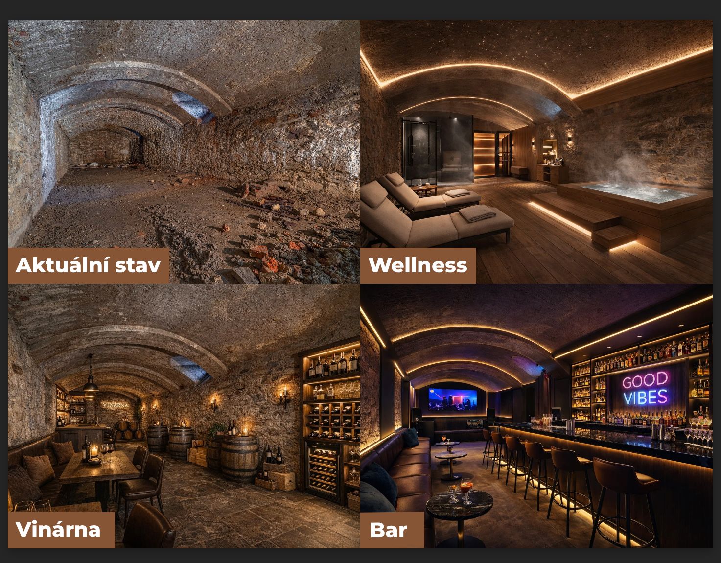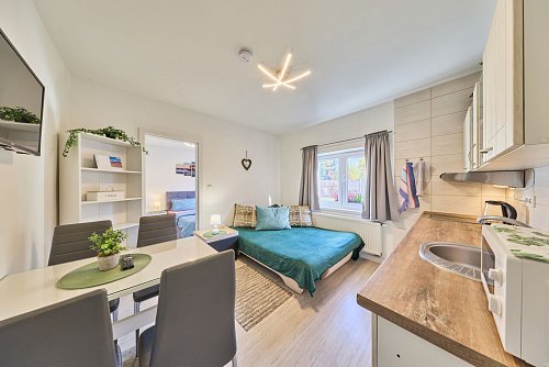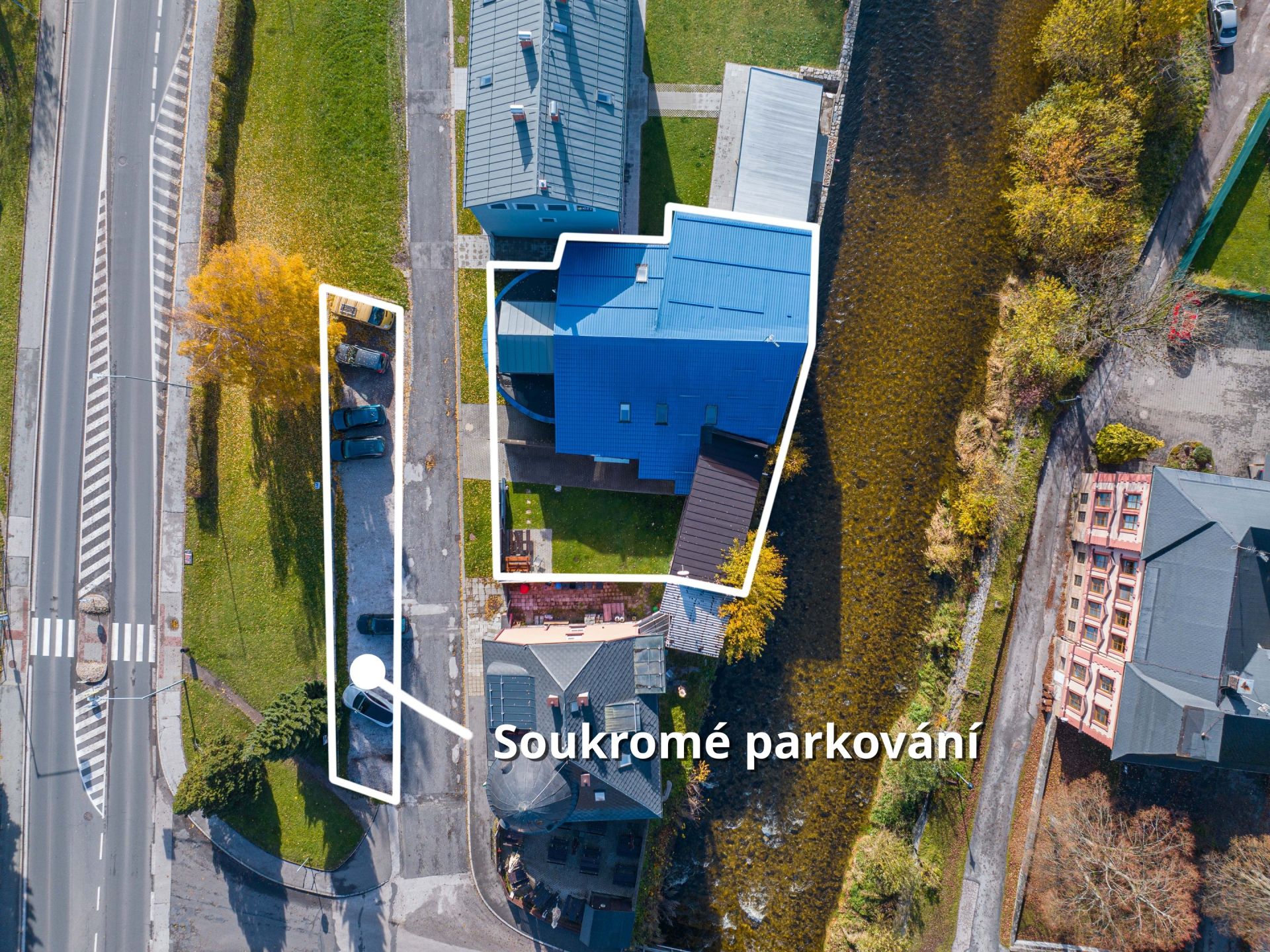 • nebytový prostor (276 m²) – lze přestavět na další apartmány, byty nebo využít pro podnikání — například jako ordinaci, soukromou kliniku s apartmány, snídaňové bistro k apartmánům ad.