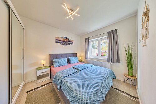 Na druhém pozemku se nachází samostatný apartmánový dům – 1+1 o výměře 30 m². Celková plocha domu je přibližně 703 m² a pozemky o celkové výměře 800 m².