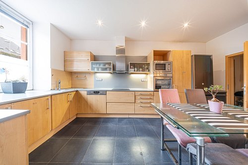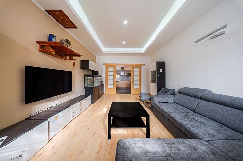 Dispozice: vstupní chodba, kuchyně, prostorný obývací pokoj, tři samostatné pokoje a dvě koupelny, což zajišťuje komfort i pro větší rodinu.